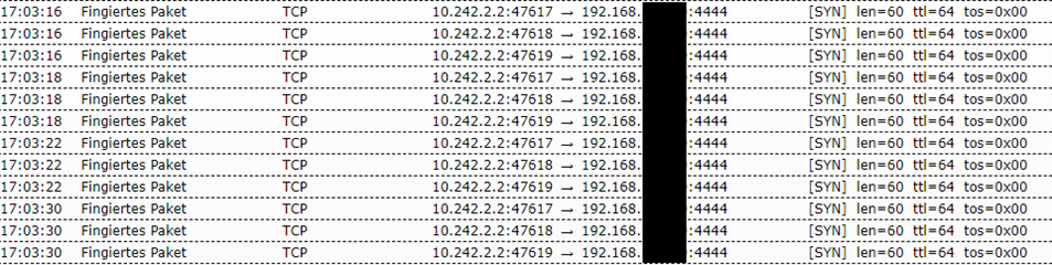 2019:05:05-19:42:59 utm ulogd[4823]: id="2005" severity="info" sys="SecureNet" sub="packetfilter" name="IP spoofing drop" action="IP spoofing drop" fwrule="60008" initf="tun0" srcip="192.168.198.2" dstip="192.168.197.90" proto="6" length="60" tos="0x00" prec="0x00" ttl="64" srcport="45802" dstport="4444" tcpflags="SYN"