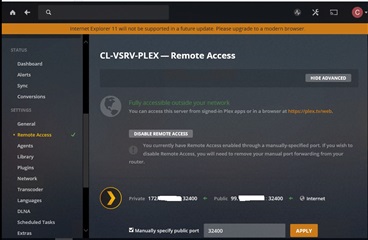 When I attempt to enable Plex remote access,  it first says "Fully accessible outside your network"...  then about 4 to 5 seconds later it says "Not available outside your network".