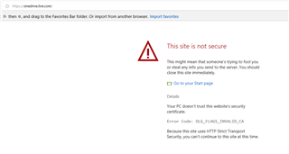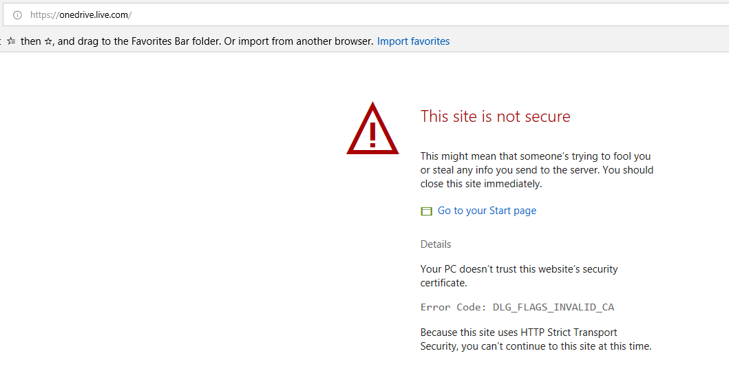 Your PC doesn’t trust this website’s security certificate. Error Code: DLG_FLAGS_INVALID_CA Because this site uses HTTP Strict Transport Security, you can’t continue to this site at this time. |