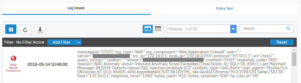 The following is the screenshot grabbed at Log Viewer for Web Server Protection.