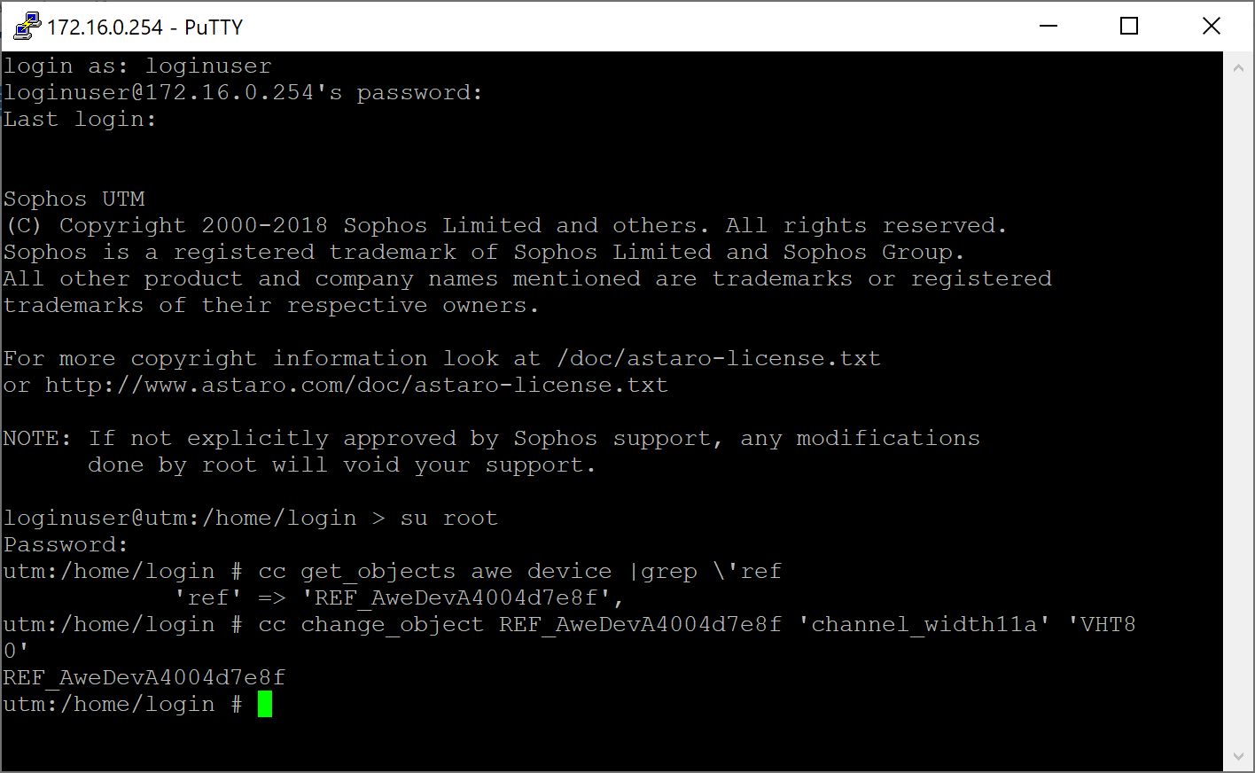 - Bei dem Befehl: "cc change_object REF_AweDev1 'channel_width11a' 'VHT80'" bekomme ich als Antwort "0", was wohl bedeutet das es kein Objekt gibt das REF_AweDev1 heißt auf dem der Befehl angewendet werden kann.