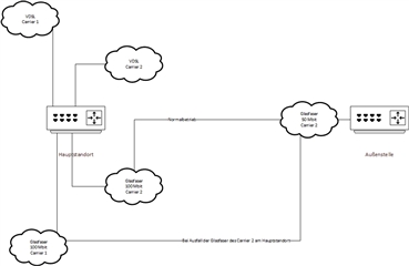Am Hauptstandort gibt es zwei VDSL Anschlüsse die über Kupfer rein kommen und zum surfen genutzt werden. Diese kommen über zwei verschiedene Carrier und wege rein.