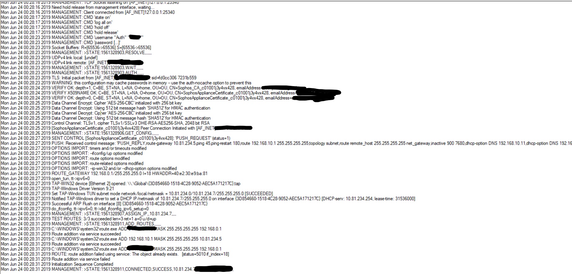When trying to connect to using the Sophos Vpn (Windows) client to Sophos XG, using the protocol OpenVPN i get the following error message in de log: