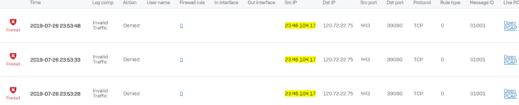 I have an issue and I need your assistance. One of our client's messaging system is having erratic connection issues. When I checked the Firewall I found out from logs that SOPHOS is blocking the traffic, marking it invalid. There were no alrams like internet disconnection from our SOPHOS Firewall. Can anyone give me any idea what is happening. From the logs the invalid traffic is placed under Firewall ID 0, which means SOPHOS cannot identify the said traffic based on my research. Please check below for some screenshots.