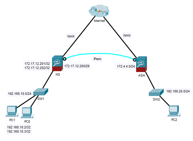 In the IPsec tunnel configuration, we have the 172.17.12.200/29 on the left SA and for the right SA, 172.4.4.0/24.