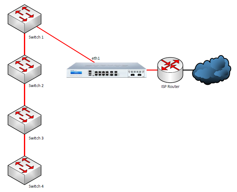 But the problem that I have is : If switch 1 goes down then the whole network is down, that's why I attempted to bridge the 4 interfaces to avoid that case of figure has each switch will then be directly connected to the Sophos (Only 25% of the network would be down)