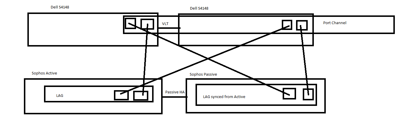 I have 2 Sophos devices and have them configured in HA. I want to be able to connect each of my Dell S4148s to each Sophos device. To do this I have created a LAG on ports 11/12 on the Sophos devices with an IP of 10.10.10.1 and then on the S4148s I have created a port channel with VLT setup for ports 51 and 52 on each switch. I then allow VLAN over these and assign the VLAN an IP address of 10.10.10.2