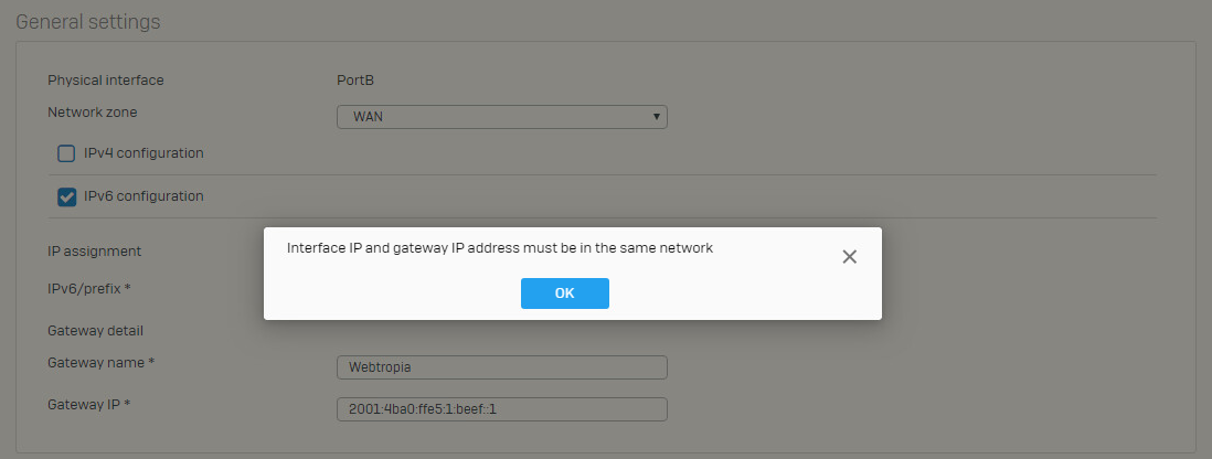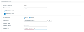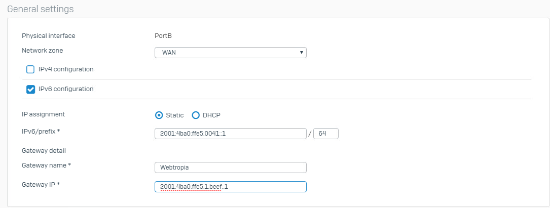 In addition, an IPv6 address must be set up here, with the gateway outside the network. In the Windows server and also with a Linux server this is easily possible. With the Sophos XG it is not possible to configure this.