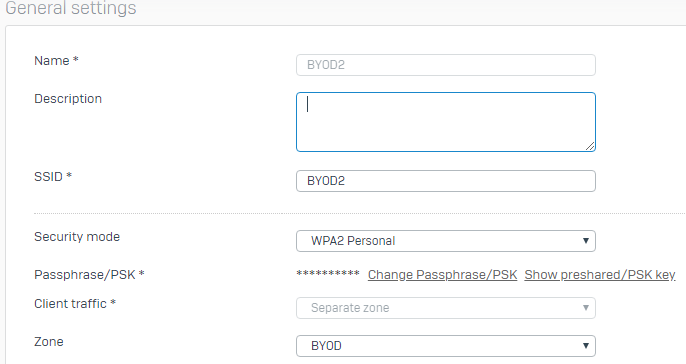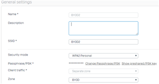 Then I created a "BYODTest" SSID. I set it to "Bridge to VLAN" and set the VLAN ID to 8 and set the encryption mode to WPA2-personal.