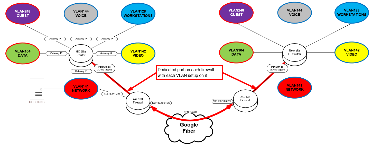 RED tunnel would "extend" the VLANs it knows about across the internet, like a QinQ setup, all at layer 2...???