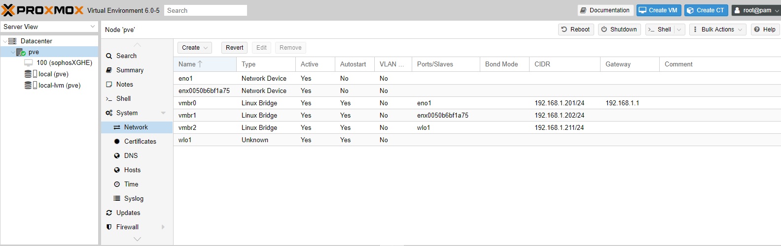 In my ProxMox setup I have the internal NIC (eno1) bridged to vmbr0 and the USB-NIC (enx.....) bridged to vmbr1. In creating the VE for Sophos XG Firewall Home Edition I have 6 GB of memory, 64 GB of disk space and two Network Interfaces, net0 (vmbr0) and net1 (vmbr1) see attached screen shot of the VM configuration.