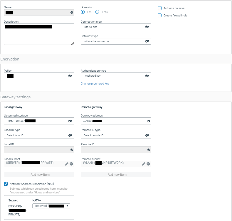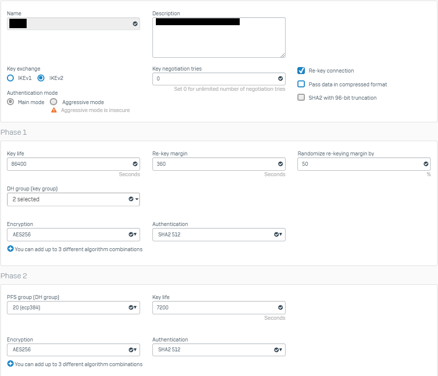 I am trying to setup a site-to-site VPN connection and followed the guides from Sophos. But, it keep failing. First, I have created an IPSec policy using the following configurations: