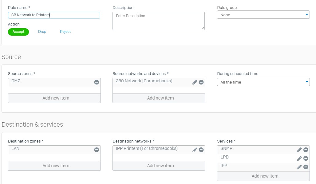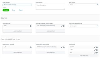 My network is setup that my primary LAN is port A1 (zone LAN) and hosts all of my Windows clients/servers/printers/etc in 10.21x.x.x networks. When we got the XG, we setup an additional 10.230.x.x network on port A4 (zone DMZ) specifically for our Chromebooks to get all of our inline filtering and other routing and such out of their way so they work better. Since we've done that they absolutely do work better in most cases. The thing that's puzzling me is getting some of the services from our regular network accessible to the Chromebooks, namely desktop monitoring software and local/non-cloud printing.
