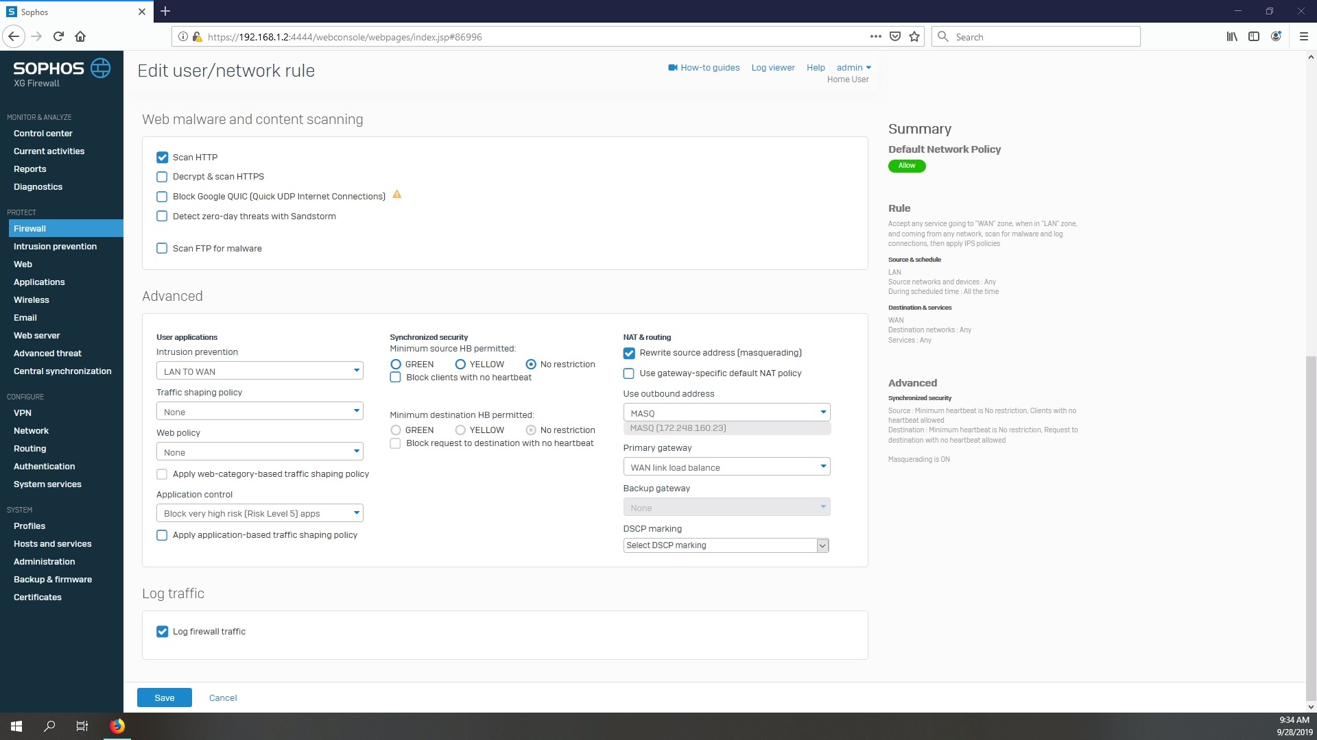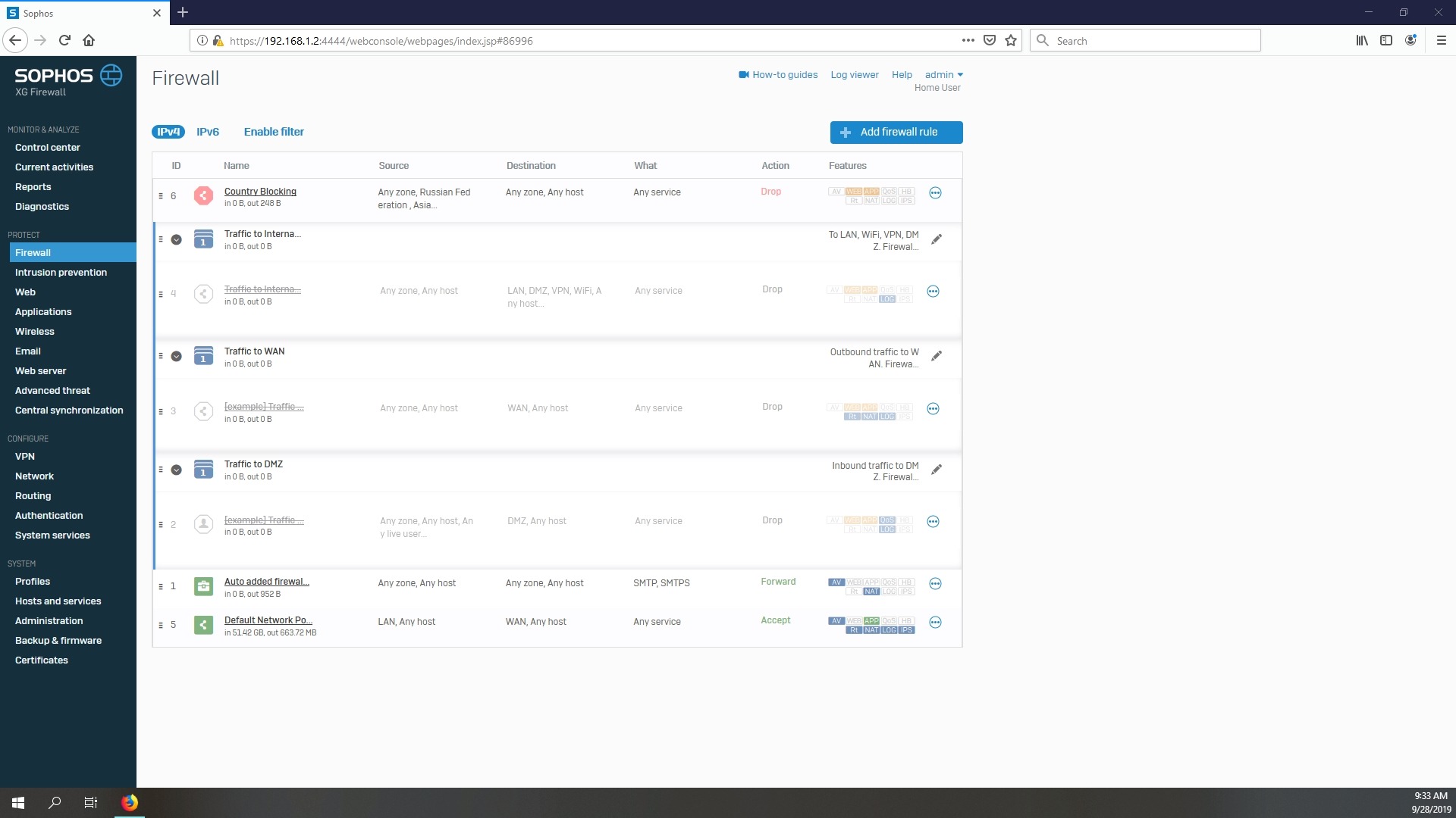 Note that some of the rules in the screenshot are actually grayed out and were just example rules Sophos added during the install. Currently I have the default network allow all in place (LAN to WAN) and a country blocking rule. That's it for the moment.