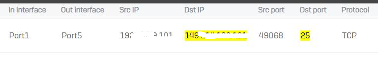 10:44:34.490886 Port5, OUT: IP 192.168.9.101.49108 > 149.XXX.XXX.161.25: Flags [S], seq 1443620852, win 29200, options [mss 1460,sackOK,TS val 42770248 ecr 0,nop,wscale 7], length 0