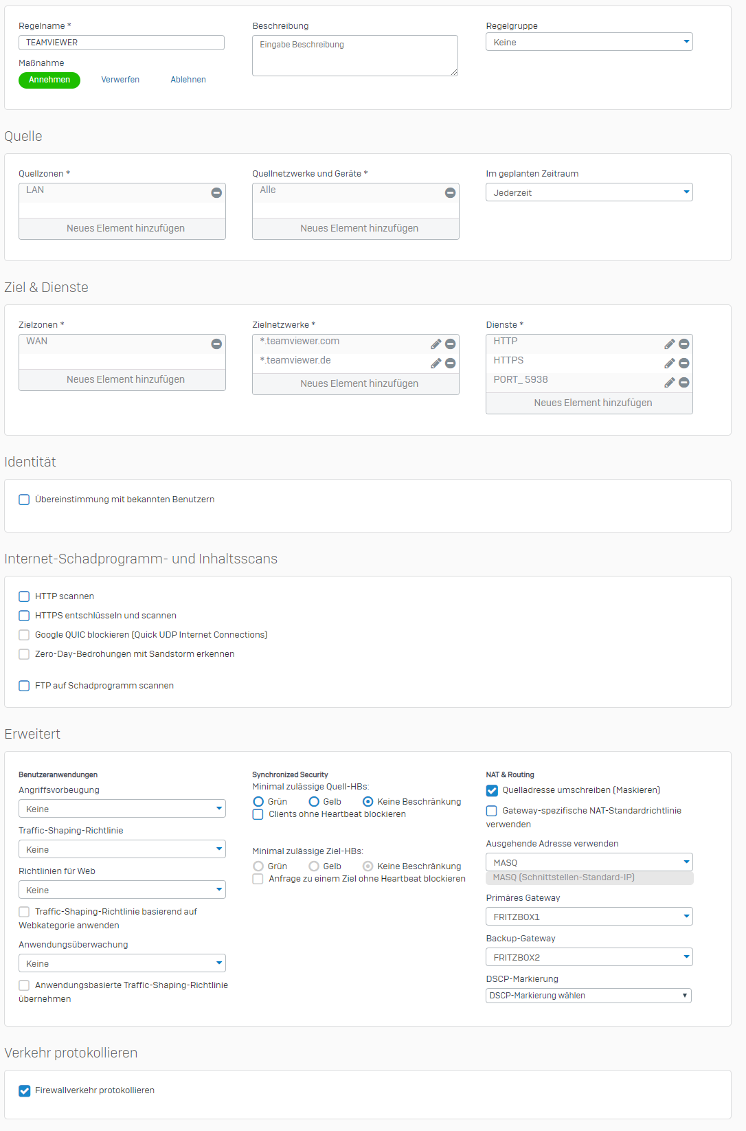 LAN,internes Subnetz --> WAN *.teamviwer.com --> Port 5938,80,443 --> Keine Scans wie IPS,web etc. MASQ ist af STD WAN GW Adresse eingerichtet kein DSCP