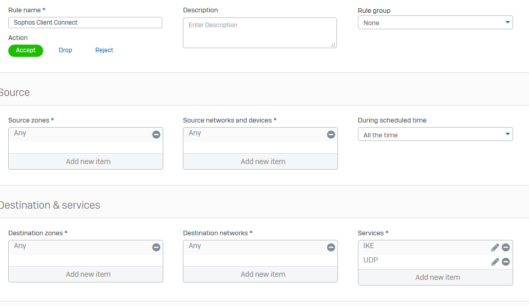 I have created a rule to allow UDP and IKE like this: