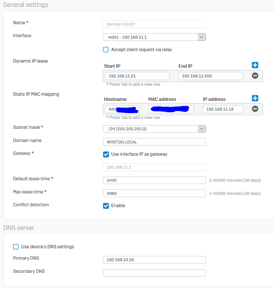 Ich habe eine Konfiguration von einer XG mit RED15 und dabei funktionieren ein paar Netzwerk anfragen nicht. Die Konfiguration habe ich gemacht wie beschrieben und hatte auch schon Hilfe bei der Firewall. Ich habe zwei DHCP Server in der XG aufgesetzt; eines für das LAN und eines für das RED verbunden mit dem Interface "RED". Der AD / DNS ist auf einem Windows Server.
