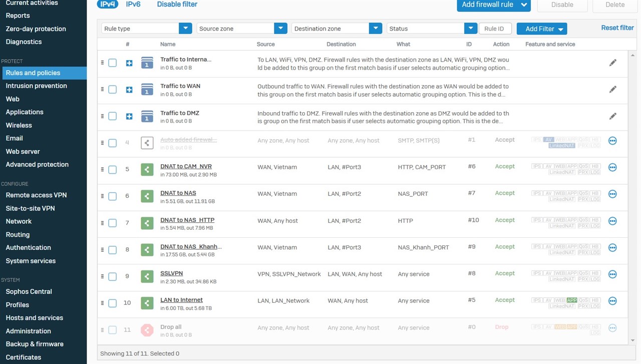 When I look into NAT rule, I see that the SNAT rule for outgoing traffic to Internet has the number of usage still zero (0). I turn off this SNAT too to see what happen (rule ID 6 is disabled):