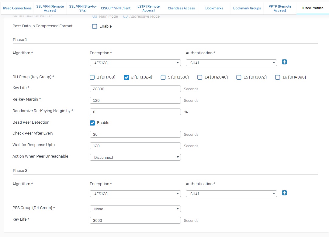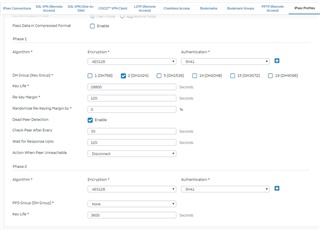 Please note, you may use these additionally supported IPSec parameters for encryption like AES256 and other DH groups like 1,2, 5, 14-18, 22, 23, and 24.