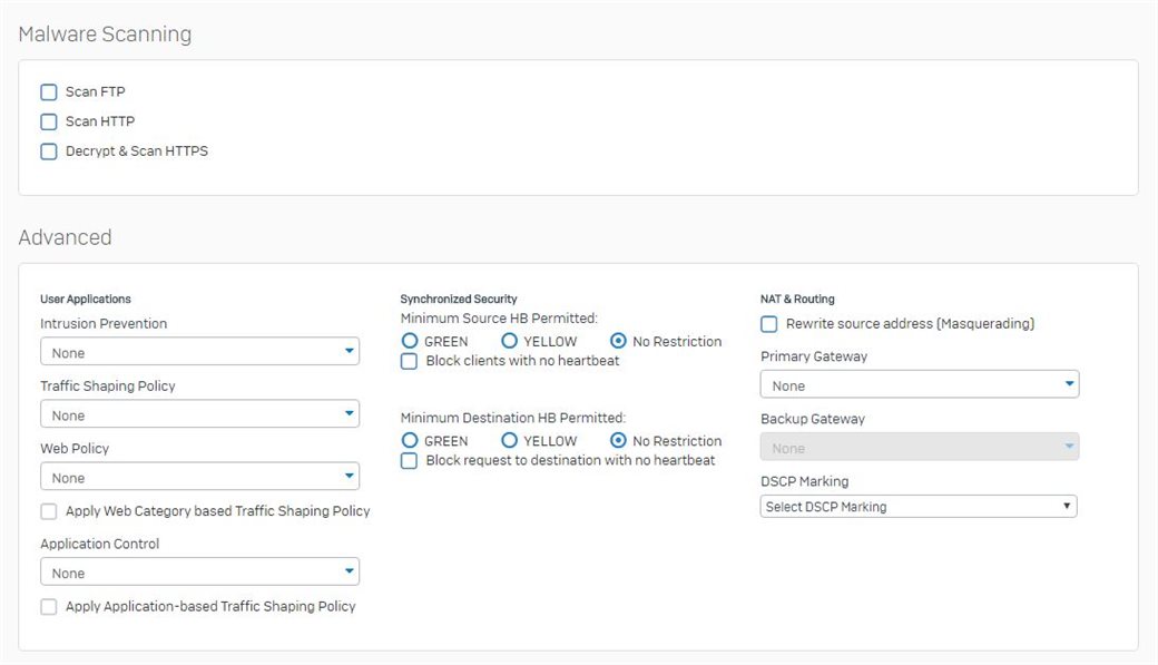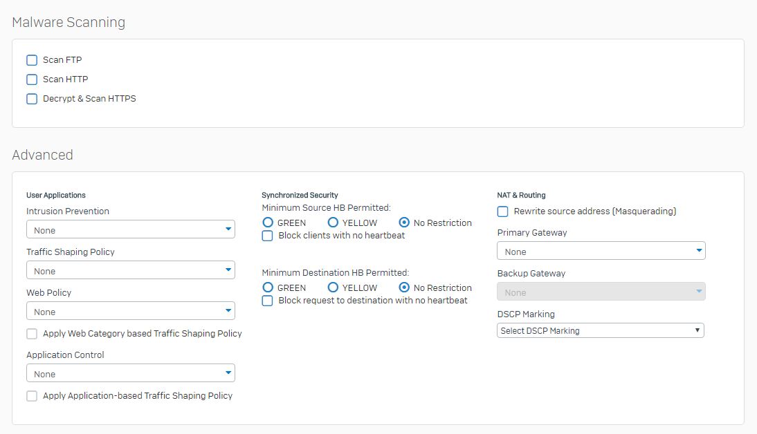 I believe that the sophos is intercepting the traffic and blocking it, but i can't work out why because the firewall policy doesn't include any scanning.