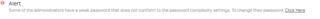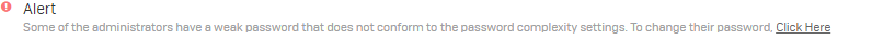 • Alert: "Some of the administrators have a weak password that does not conform to the password complexity settings. To change their password, Click here"