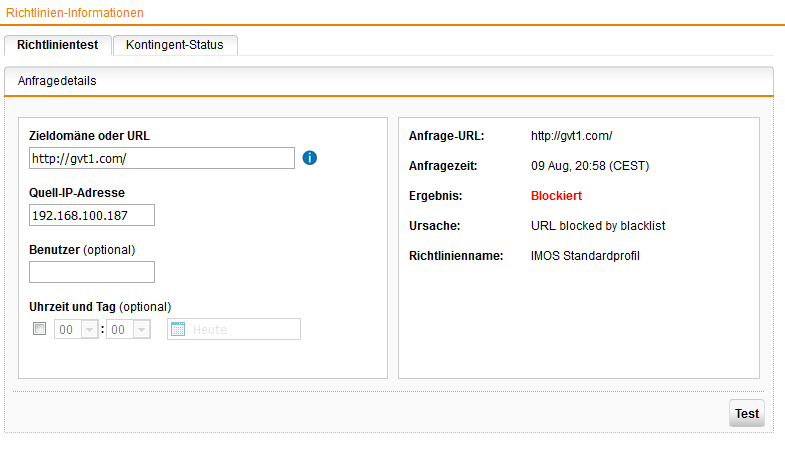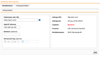 Über einen Eintrag in dem verwendeten Standardprofil lies sie sich dann blocken, was der Richtlinientest besagte: