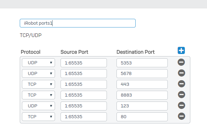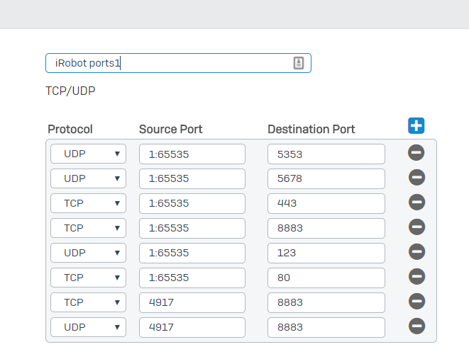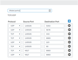 • Ugh - why in the world did iRobot plan this way of communication. What a pain. I added these ports with LAN as source and WAN as the destination. I assigned this rule specific to the robot IP. Still does not work. I see traffic on the rule. Any other suggestions?