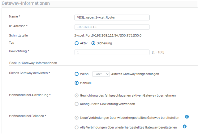 Zwei Gateway sind Aktiv. Ein Gateway wurde als Typ "Sicherung" eingestellt.