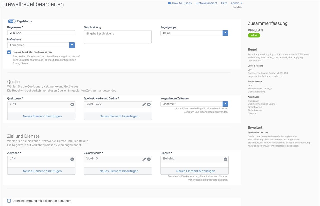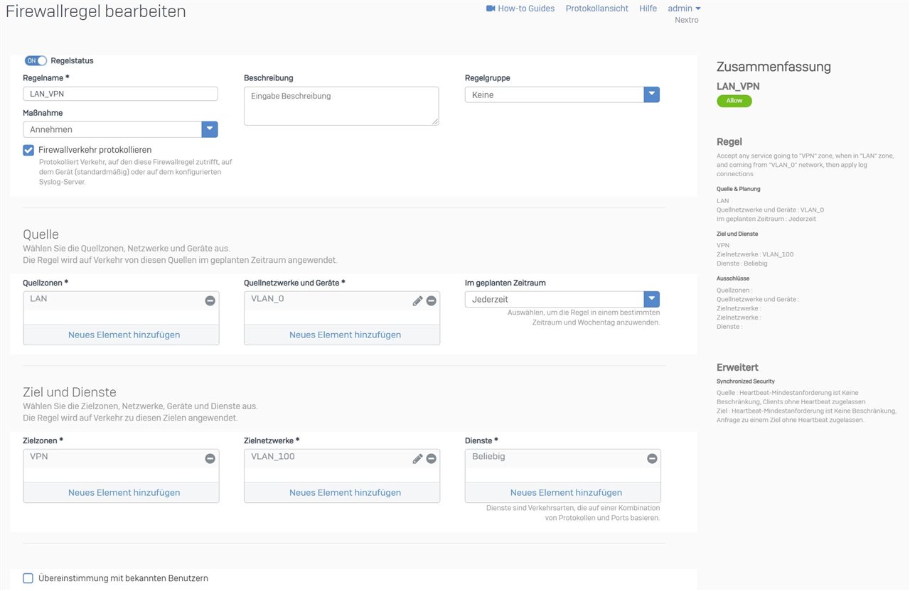 • Schau im Sophos Connect, ob die SA aufgebaut wurde. Warum heißt das Netzwerk vom IPsec VLAN100? Existiert das VLAN bereits irgendwo?