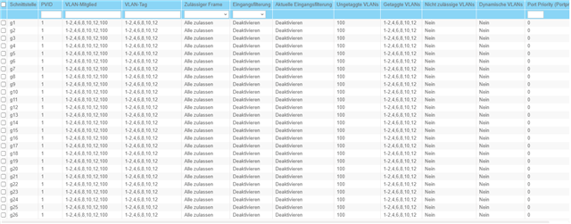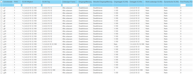 Auf jeden Fall muss Port 15 ebenfalls VLAN Member von 100 sein, aber Untagged. Bei den anderen Ports sieht es ja ebenfalls gut aus, nur dass dort zwei VLANs Untagged sind und das kann nicht funktionieren.