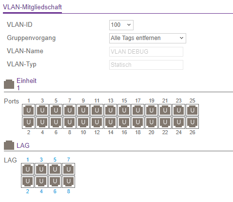 • Im vorderen Bereich befindet sich die Spalte „VLAN Tag“ dort ist nun bei GE15 100 eingetragen. Ist es nicht möglich zusätzlich hinten 100 als Untagged einzutragen? Nun steht dort nämlich wieder „Nein“.