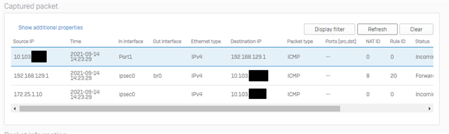 Wie man im Packet Capture sieht wird die 172er Adresse auch richtig auf die 192er Adresse geNATed und kommt beim Ziel an. Nur leider scheint das Returnpaket an der Sophos verloren zu gehen und landet nicht beim Client.