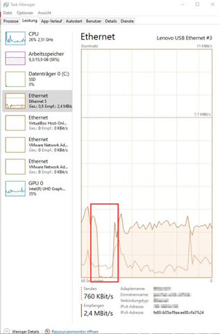 Auf dem Client ist dann auch zu erkennen, das Der Netzwerk-Traffic nahezu komplett einbricht: