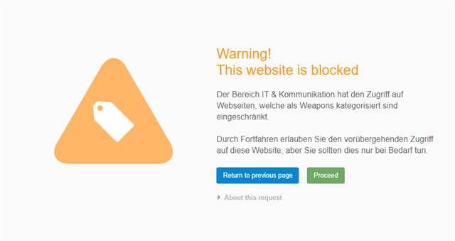Ist im Intercept X Client die Kategorie (Webseite) blockiert (z. B. Waffen), wird keine Meldung im Browser angezeigt.