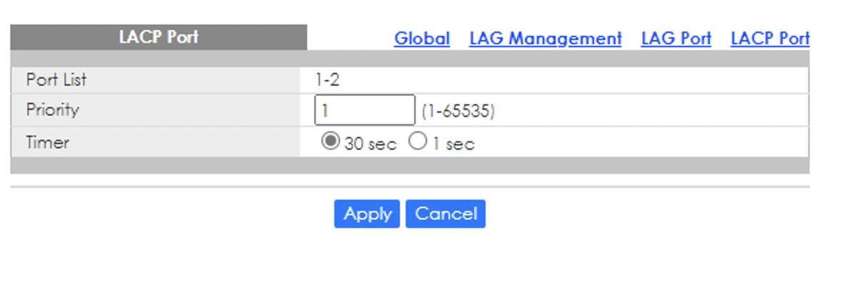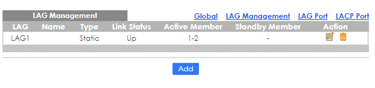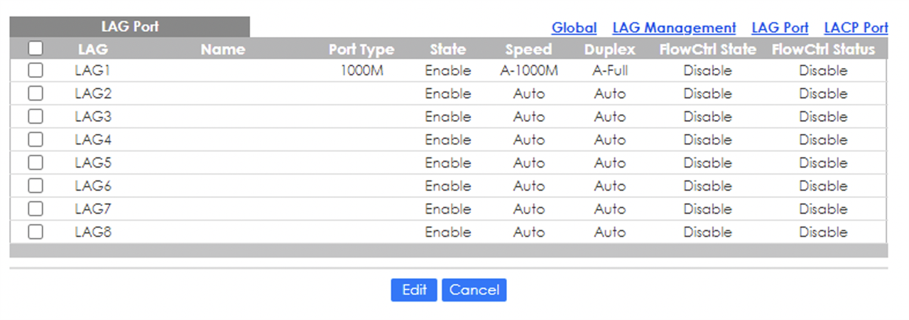 Wenn ich hier LACP State Enable setze, werden die Ports als DOWN angezeigt. Hier die weitreren Screenshost aus dem Menü LAG:
