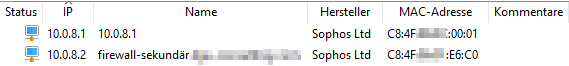 Ist es korrekt, dass beide Firewalls die IP der primären Firewall anzeigen (10.0.8.1)? Weil dies die IP-Adresse ist, mit welcher die primäre arbeiten soll? Sprich wenn die primäre abraucht, wird die auxilary ja zur primären und arbeitet ab dann mit der 10.0.8.1. Im auxilary Betrieb hat sie jedoch die 10.0.8.2 (was offensichtlich passt), vermutlich zeigt die Anzeige jedoch die Werte für den Primär-Betrieb an?