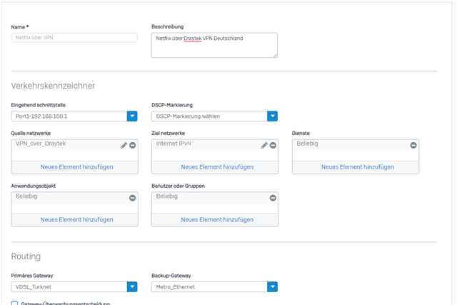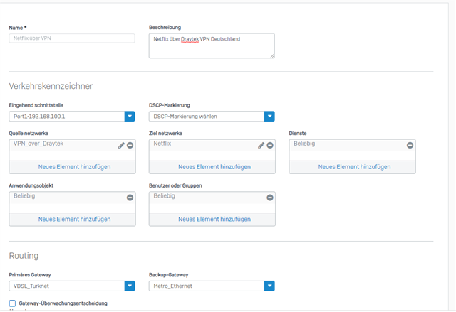 Ich möchte nun dass Streaming Dienste wie Netflix oder Youtube mittels SD-WAN über den zweiten WAN rausgehen, um die Landesbeschränkungen zu umgehen.