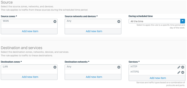 Ist das so richtig? Ich verstehe das so: Aus Zone WAN darf alles/jeder in die Zone LAN zu allen Zielen aber nur HTTP und HTTPS.