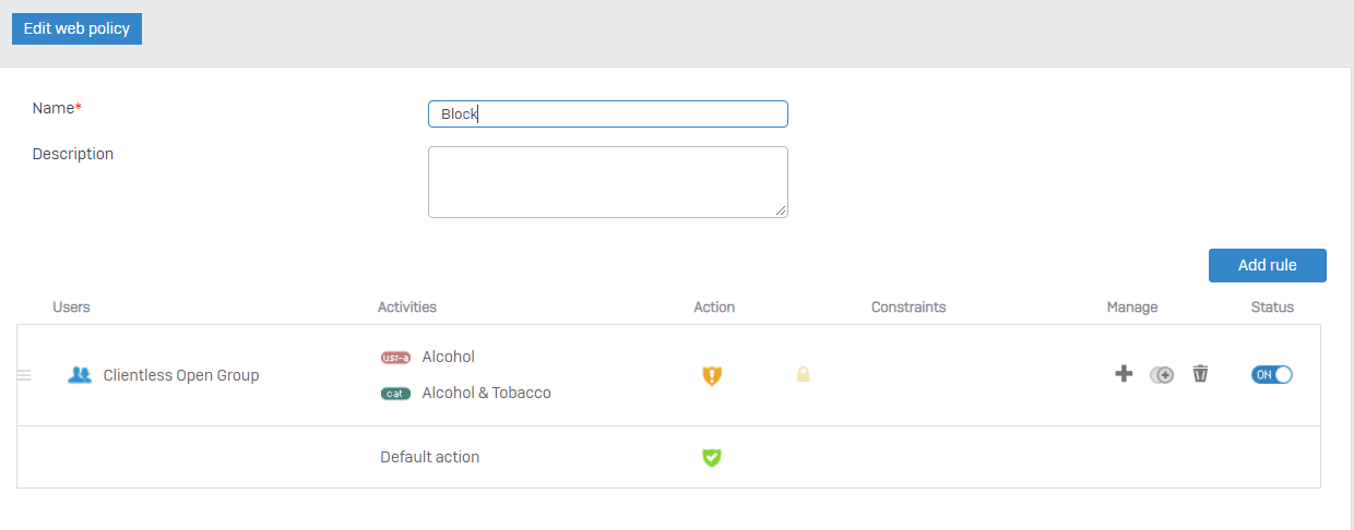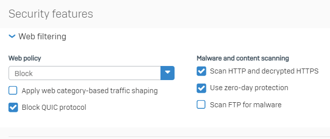 • Das ist ein gewolltes Verhalten. Die Firewall blockiert Port80/443 mit dem Web Proxy und nicht der Firewall selbst. Dadurch hat der Enduser eine Block Website im Browser und kein "Connection time out" vom Browser selbst. Du siehst das auch daran, dass im Logviewer zwar die Firewall grün ist, aber wenn du ein Mouse Over machst, die Web Policy "Deny All" ist.