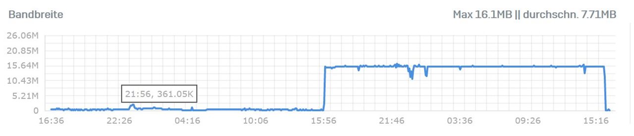 • Also das mit den 1TByte, respektive 8TBit (als Nutzdaten/Filegröße) in 24h bei 120 MBit/s passt schon auf, denn wer weiß, welcher Overhead da noch hin- und hergeschoben wird. Außerdem zeigt mir der Taskmanager/Recourcenmonitor auf beiden Seiten ebenfalls diesen Wert an. Up-/Download sind übrigens z.Z. auf beiden Seiten sysmetrisch 300 Mbit/s - diese werden auch gem. Speedtest regelmäßig erreicht.