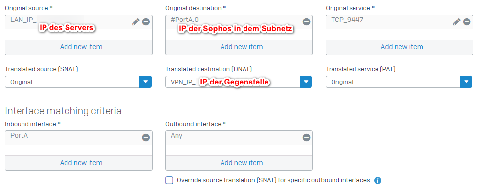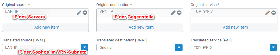 Wir haben dazu eine NAT-Regel angelegt, die eine Adresse aus dem vorgegebenen Netz per SNAT als neue Quelle definiert und die Anfragen per DNAT an die IP der Gegenstelle des VPNs schickt.