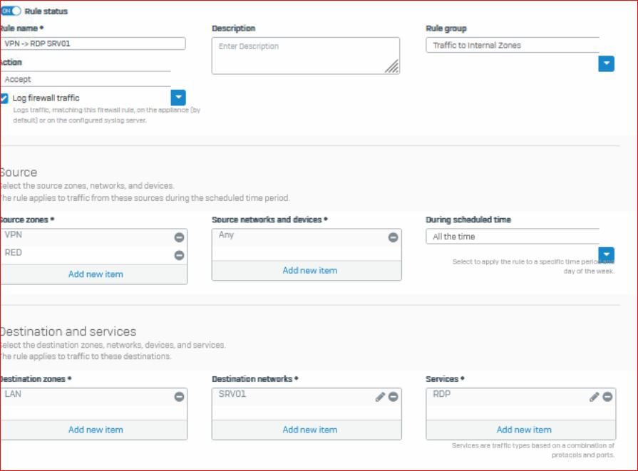 ich habe an eine bestehende Sophos XG 106w um eine Sophos RED SD 20 erweitert um von einem anderen Standort per RDP auf eine VM zuzugreifen,