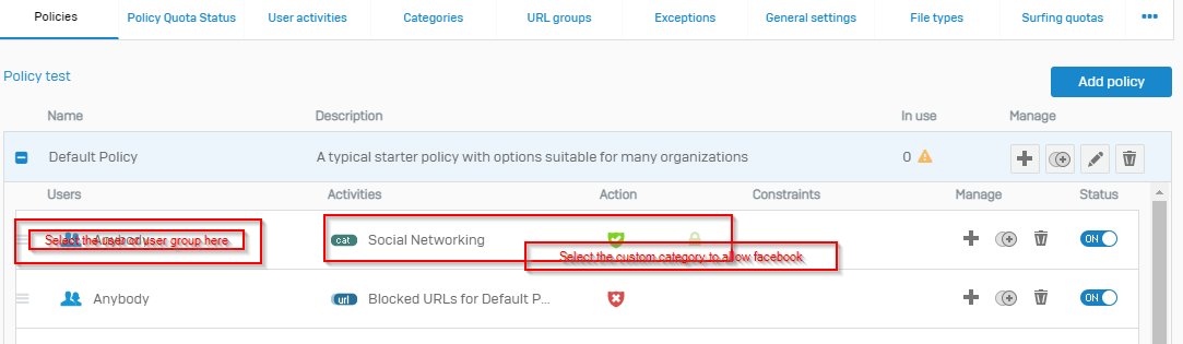 Folgend habe ich den User in die zuvor synchronisierte AD Gruppe hinzugefügt und eine Web-Richtlinie erstellt, womit die Gruppe auf Facebook zugreifen kann. Das funktioniert auch, aber nur solange der User im CaptivePortal angemeldet ist