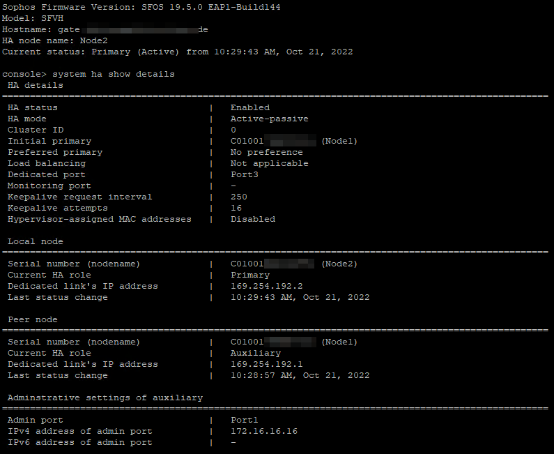 Auxiliary node reachable using webadmin / ssh. Primary node reachable using ssh through HA-interface from auxiliary node.