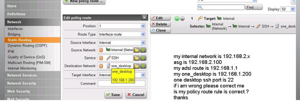 can u please check this and please let me know whether my policy route is correct or no if possible can u please send me 1 sample of static and policy route with some words