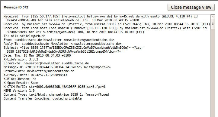 2010:03:18-08:53:35 astaro pop3proxy[24257]: id="1101" severity="info" sys="SecureMail" sub="pop3" name="email quarantined" from="sueddeutsche.de" to="nils.schiele@web.de" subject="Neue Pläne der Bundesregierung - Koalition will Steu