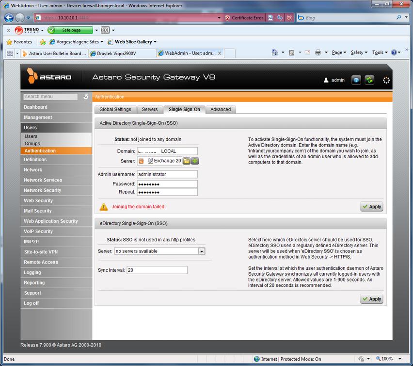 i configure the Single-Sign-On and the Astaro isn't able to join the Domain on Windows Server 2008 R2. See Screenshot for Info.