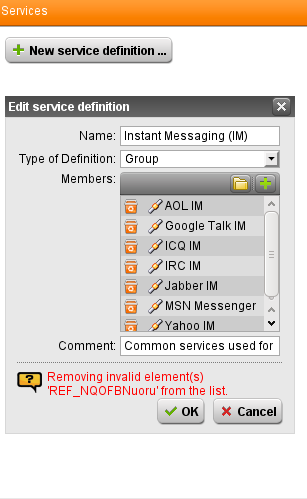 I created a new service for MSN Messenger (dstPort 1863) and tried to add this service to the existing "Instant Messaging (IM)" group.
