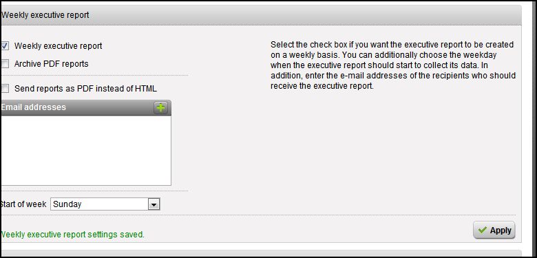 I can check the enable executive report without providing the email address. I thought I had weekly and monthly reports not coming in for some reason till I noticed that I hadn't supplied an email address.